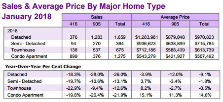As listings rose, the average sales price for all types of homes fell 4.1 per cent across the GTA in January to $736,783, a decline from $768,351 a year ago, weighed down by weakness in the detached house segment. However lack of inventory in condo market led to a 22-per-cent drop in the number of condo units sold in January across the GTA compared to a year ago, while the average condo price climbed 15 per cent to $507,492 across the region.